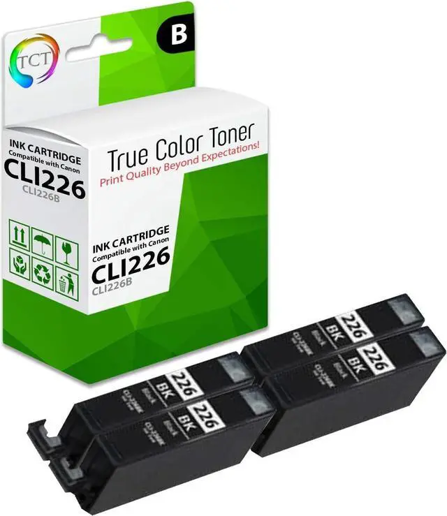4 Pack TCT Compatible Canon CLI226 Black Replacement Ink CartridgeReplaces OEM: CLI226BBox Contains: 4 Black ink cartridgesPrinter Compatibility: Canon Pixma iP4820 iP4920, iX6520, MG5120 MG5220 MG5320 MG6120 MG6220 MG8120 MG8120B MG8220, MX712 MX882 MX892TCT: Print Quality Beyond Your Expectations!With TCT ink cartridges, you can enjoy the full benefits of high quality printing and exponential savings.Dependable Printer Supplies.Specially formulated ink provides the highest print quality from Canon CLI-226 ink cartridges. Our IP4820 ink cartridges are designed and engineered to work for specific set of printers to achieve high accuracy and consistent prints.Excellent Premium Printing Experience.TCT provides premium IP4920 ink cartridge replacements that are reasonably priced for reliability, quality and performance. Every printer cartridge is manufactured using the latest technologies adhering the strict STMC and ISO factorystandards making our products ISO9001 and ISO14001 certified.Reliable Customer Service.We have a team of committed and friendly technical assistants ready to offer every customer expert advice. Experience hassle-free online shopping.Extensive Range of Ink Cartridges.We offer a wide variety of CLI-226 Black ink cartridges in different value packs that sticks to your budget. Choose the right package and save on your supplies. Guaranteed 100% brand new and work seamlessly with your MG5120 printer.