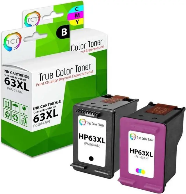 TRUE COLOR TONER: Print Quality Beyond Your Expectations!With True Color Toner compatible ink cartridges, say goodbye to outrageously priced toner cartridges! Our premium cartridges are the perfect replacements to their OEM versions.* Contents: 1 63XL Black and 1 63XL replacement Ink Cartridges* Replaces OEM#(s): F6U64AN (63XL BK), F6U63AN (63XL CL)* Page Yield(s): 480 pages per Black and 330 per color cartridge average page yield at 5% coverage.*Package Quantity: Two Pack ( 1BK,1CL )* Compatible with: HP Deskjet 1112, 2130, 3630, 3632; Envy 4520; Officejet 3830, 4650* Warranty: TCT cartridges are Manufactured in ISO 9000 and 10041 certified facilities. We guarantee the quality and reliability of our compatible cartridges, and back them with a 1 Year warranty against manufacturer defects.