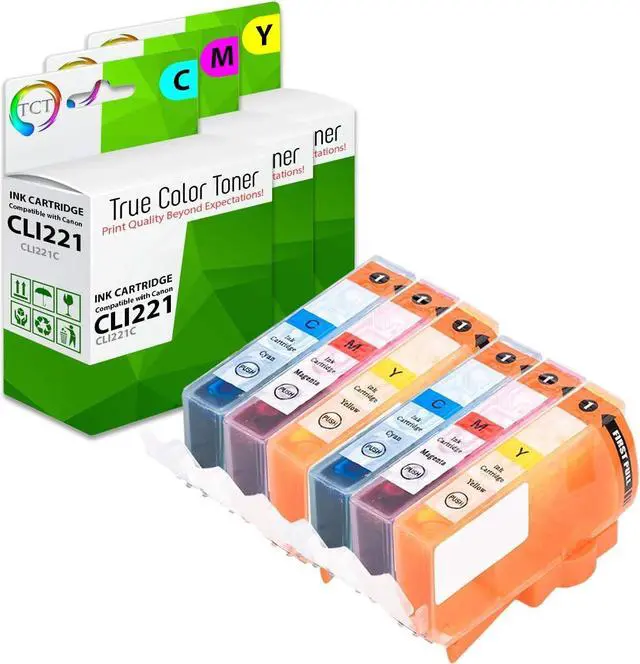 TRUE COLOR TONER: Print Quality Beyond Your Expectations!With True Color Toner compatible ink cartridges, say goodbye to outrageously priced toner cartridges! Our premium cartridges are the perfect replacements to their OEM versions.* Contents: 2 CL221C Cyan, 2 CL221M, and 2 CL221Y replacement Ink Cartridges* Replaces OEM#(s): CLI221C, CLI221M, CLI221Y* Page Yield(s): 500 pages average page yield at 5% coverage.* Package Quantity: Six Pack ( 2C,2M,2Y )* Compatible with: Canon Pixma iP3600, iP4600, iP4700, MP540, MP560, MP620, MP620B, MP640, MP640R, MP980, MP990, MX860, and MX870* Warranty: TCT cartridges are Manufactured in ISO 9000 and 10041 certified facilities. We guarantee the quality and reliability of our compatible cartridges, and back them with a 1 Year warranty against manufacturer defects.