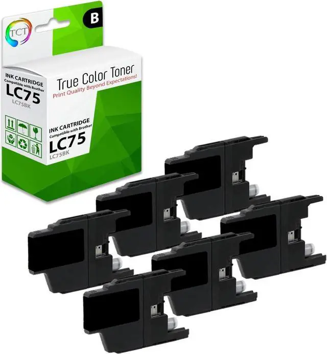 TRUE COLOR TONER: Print Quality Beyond Your Expectations!With True Color Toner compatible ink cartridges, say goodbye to outrageously priced toner cartridges! Our premium cartridges are the perfect replacements to their OEM versions.* Contents: 6 LC75 Black replacement Ink Cartridges* Replaces OEM#(s): LC75BK* Page Yield(s): 600 pages average page yield at 5% coverage.* Package Quantity: Six Pack ( 6BK )* Compatible with: Brother MFC-J6510DW MFC-J6710DW MFC-J6910DW MFC-J280W MFC-J425W MFC-J430w MFC-J435W MFC-J5910DW MFC-J625DW MFC-J825DW MFC-J835DW Printer* Warranty: TCT cartridges are Manufactured in ISO 9000 and 10041 certified facilities. We guarantee the quality and reliability of our compatible cartridges, and back them with a 1 Year warranty against manufacturer defects.