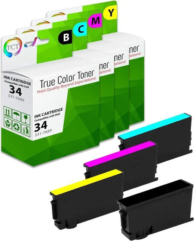 TRUE COLOR TONER: Print Quality Beyond Your Expectations!With True Color Toner compatible ink cartridges, say goodbye to outrageously priced toner cartridges! Our premium cartridges are the perfect replacements to their OEM versions.* Contents: 1 34B Black, 1 34C Cyan, 1 34M, and 1 34Y replacement Ink Cartridges* Replaces OEM#(s): 331-7689 (Black), 331-7690 (Cyan), 331-7691 (Magenta), 331-7692 (Yellow)* Page Yield(s): 750 pages per Black and 700 per color cartridge average page yield at 5% coverage.* Package Quantity: Four Pack ( 1BK,1C,1M,1Y )* Compatible with: Dell V525w, V725W* Warranty: TCT cartridges are Manufactured in ISO 9000 and 10041 certified facilities. We guarantee the quality and reliability of our compatible cartridges, and back them with a 1 Year warranty against manufacturer defects.