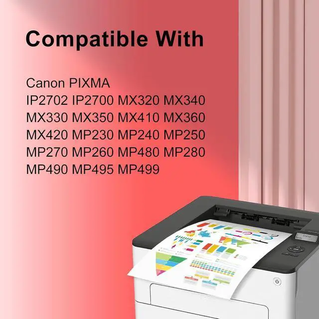 Compatible printers: Canon PIXMA IP2702, IP2700, MX320, MX340, MX330, MX350, MX410, MX360, MX420, MP230, MP240, MP250, MP270, MP260, MP480, MP280, MP490, MP495, MP499