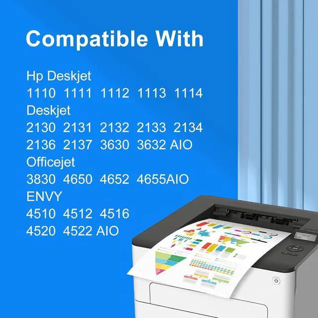 Long-term printing: Page yields equal to OEM ink cartridges Up to 480 pages per Black cartridge (5% coverage Up to 300 pages per tri-color cartridge (5% coverage) Tips: The page yield is an estimation based on the industry standard of 5% coverage only. If you print more than 5% per page, then the page yield is significantly less. Compatibility PRINTER: Desktop 1111, 1112, 2130, 2131, 2132, 2133 HP desktop 2134, 2136, 2134, 2136, 3634, 3632 desktop 3633, 3630, 3631, 3635, 3636, 3637 Envy series: 4520, 4516, 4510, 4511, 4512, 4513, 4516 4517, 4523, 4524, 4525, 4526, 4527, 4528 OfficeJet series: 4650, 3830, 3831, 3832, 3833, 3834, 4650 4652, 4654, 4655, 4656, 4657, 4658 bring reliable performance for practically project. Get laser-quality documents with crisp text. Dry fast, resist water, prints maintain a sharp look over time. Packaging: You do not worry about extra leaked ink damaging Package. Every cartridge was protected in an individual sealed plastic bag.