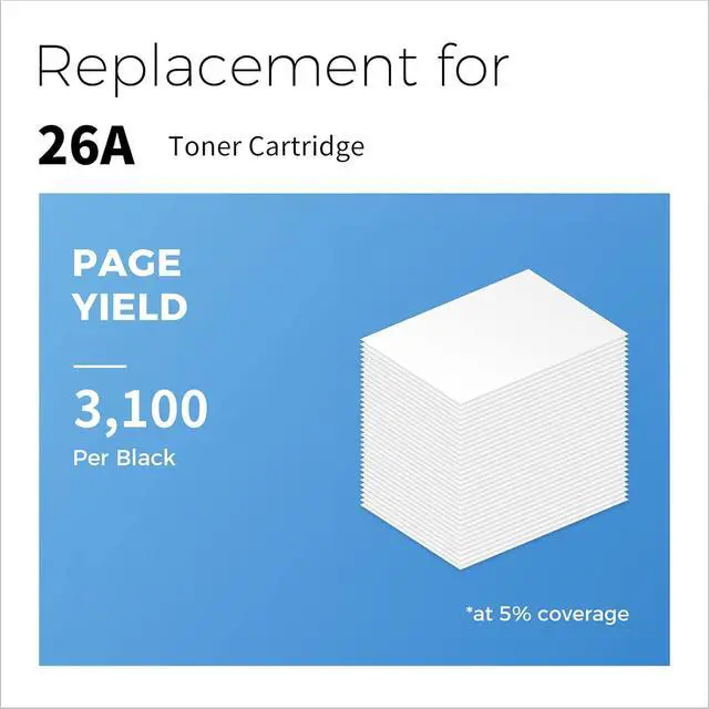Estimated page yield: myCartridge replacements for 226A 26A Toner Cartridge up to 3100 pages per 26A black Toner Cartridge(based on 5% coverage)