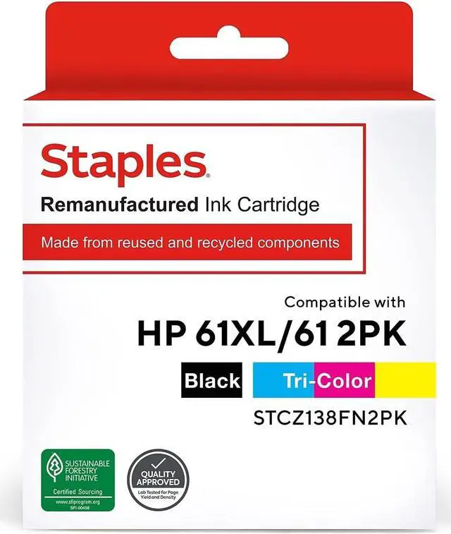 Prep your printer for extensive use with this 2-pack of Staples remanufactured black and tricolor HP 61XL/61 inkjet cartridges. Produce professional documents with this 2-pack of remanufactured inkjet cartridges. The separate cartridges let you replace only the color you need, while the rich inks bring bold lines and precise text to reports, forms and other paperwork. These Staples remanufactured HP 61XL/61 inkjet cartridges offer compatibility with select HP printers for dependable performance. Maximize your page yield while you save. Get double the print volume at a lower price with black and tricolor cartridges in one package. This Staples ink cartridge delivers high-quality printing. Comes in two cartridges per pack to save your money. Compatible with: HP DeskJet 1000, 1010, 1050 J410a, 1050A J410g, 1051, 1051A J410f, 1055 J410e, 1056 J410a, 1510, 1514, 2050 J510a, 2050 J510c, 2050A J510g, 2050A J510h, 2054A J510j, 2510, 2512. Contains 98% post-consumer recycled content. Safety Data Sheet .
