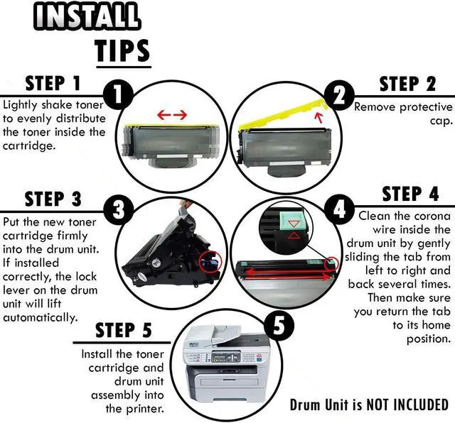 PRODUCT INFO Compatible Toner Cartridges for Brother TN-360 TN360 Package Contents INK CARTRIDGE DETAILS Page Yield Display Professional Quality Toner Advanced High-quality parts Precisely Engineered INSTALL TIPS STEP 1 STEP 2 STEP 3 STEP 4