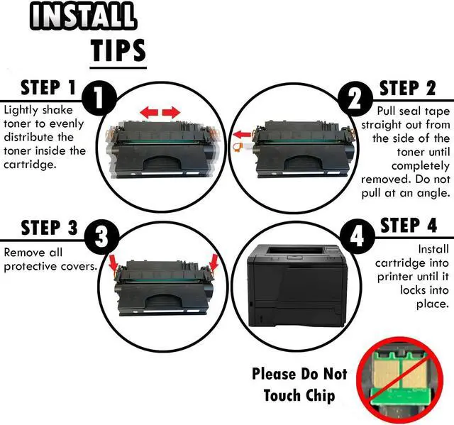 PRODUCT INFO Inkfirst Compatible Toner Cartridges for HP CE505X CF280X 05X 80X Package Contents TONER CARTRIDGE DETAILS Top Quality Photoconductor Drum Professional Quality Toner Advanced High-quality parts Precisely Engineered INSTALL TIPS STEP 1 STEP 2 STEP 3 STEP 4