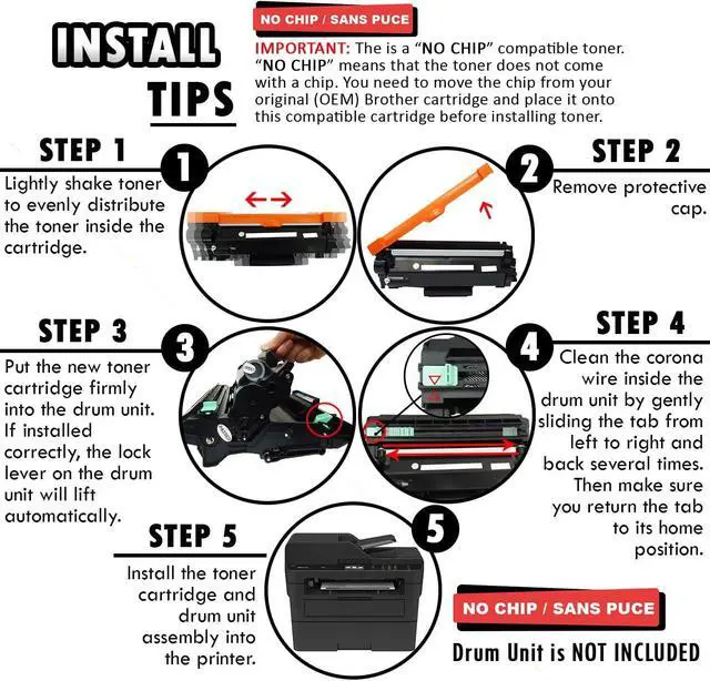 IMPORTANT: This is a NO CHIP compatible toner. NO CHIP means that the toner does not come with a chip. You need to move the chip from your original Brother cartridge and place it onto this compatible cartridge.
