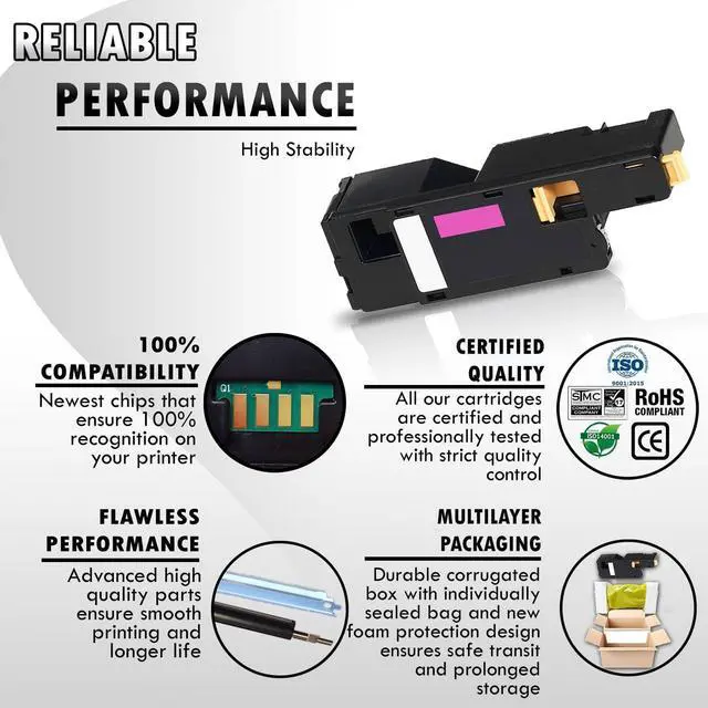 These Inkfirst compatible remanufactured 6010M magenta Toner cartridges are manufactured in ISO9001 and ISO40001 certified manufacturing facilities. These Xerox 6010M replacement Toner cartridges are cost-effective and they offer professional high printing quality for all your printing needs. You'll be getting the same OEM Xerox 6010 Magenta Toner cartridges printing quality but only at a fraction of the cost. These replacement Xerox 6010 Magenta Toner cartridges are for use in the following Xerox printers: Phaser 6010 / 6000, WorkCentre 6015.
