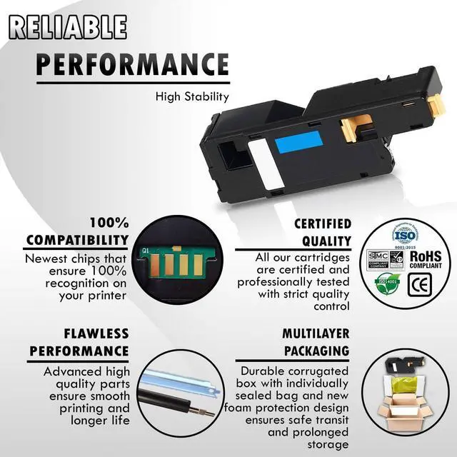 • These compatible 6010C (106R01627 / 106R1627) Toner cartridges are manufactured in ISO9001 certified factories. This ensures that our Toner cartridges for Xerox 6010 Cyan will provide the same premium printing quality as the OEM products.