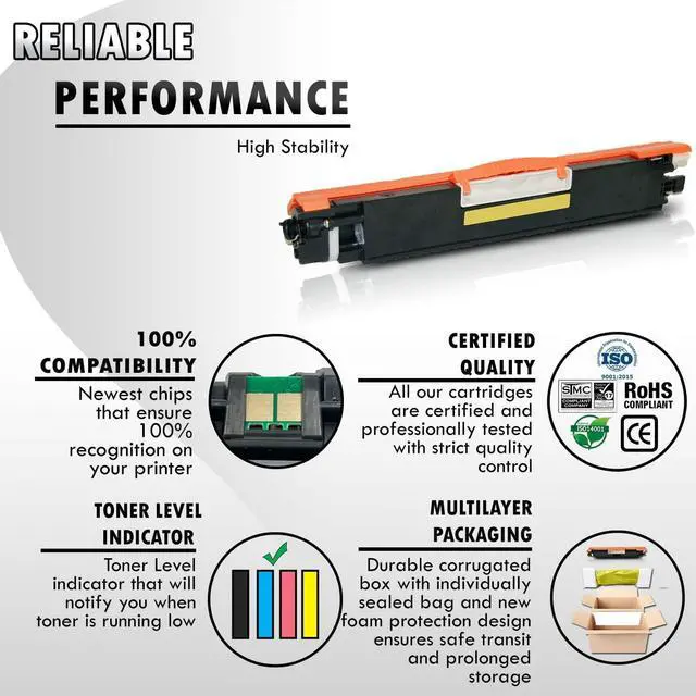 These Inkfirst compatible Toner Cartridges Replacement for HP 126A CE312A are manufactured in ISO9001 and ISO40001 certified manufacturing facilities. These replacement Toner Cartridges are cost-effective and they offer satisfying quality for all your printing needs. These compatible Toner Cartridges replacement for HP 126A CE312A are for use in the following HP printers: HP LaserJet Pro 100 color MFP M175nw/ LaserJet Pro CP1025nw/ TopShot LaserJet Pro M275 MFP Color.