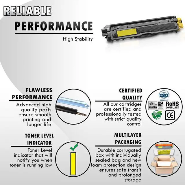 These Inkfirst compatible remanufactured TN221Y TN225Y yellow Toner cartridges are manufactured in ISO9001 and ISO40001 certified manufacturing facilities. These Brother TN221Y TN225Y replacement Toner cartridges are cost-effective and they offer professional high printing quality for all your printing needs. You'll be getting the same OEM Brother TN221 TN225 Yellow Toner cartridges printing quality but only at a fraction of the cost. These replacement Brother TN221 TN225 Yellow Toner cartridges are for use in the following Brother printers: Brother HL-3170CDW/ HL-3170CW/ HL-3140CW/ MFC-9130CW/ MFC-9330CDW/ MFC-9340CDW.