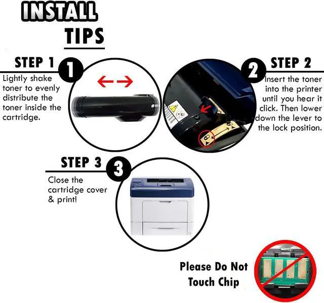 PRODUCT INFO Compatible Toner Cartridges for Xerox Phaser 3610 Workcentre 3615 (25,300 Pages) Black Extra High Yield 106R02731 Package Contents Professional Quality Toner Advanced High-quality parts Precisely Engineered INSTALL TIPS STEP 1 STEP 2 STEP 3 STEP 4