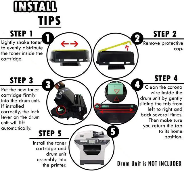 PRODUCT INFO Compatible Toner Cartridges for Brother TN-650 TN650 Package Contents INK CARTRIDGE DETAILS Page Yield Display Professional Quality Toner Advanced High-quality parts Precisely Engineered INSTALL TIPS STEP 1 STEP 2 STEP 3 STEP 4
