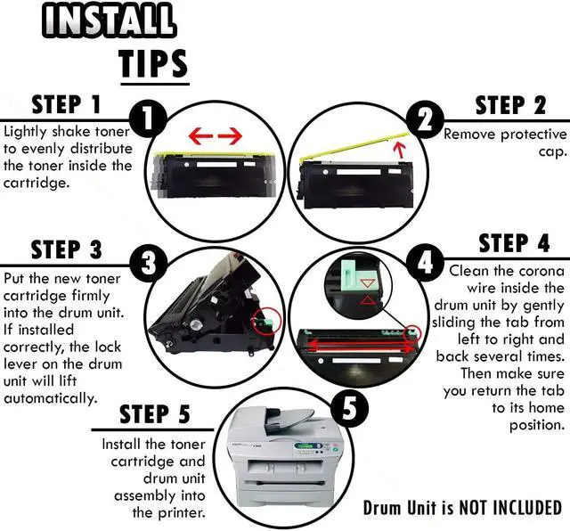 PRODUCT INFO Compatible Toner Cartridges for Brother TN-350 TN350 Package Contents INK CARTRIDGE DETAILS Page Yield Display Professional Quality Toner Advanced High-quality parts Precisely Engineered INSTALL TIPS STEP 1 STEP 2 STEP 3 STEP 4