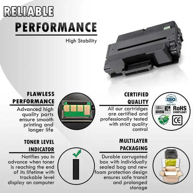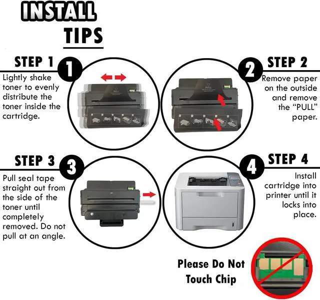 PRODUCT INFO Inkfirst Compatible Toner Cartridges Replacement for Samsung MLT-D205L D205L 205L 2PK Package Contents TONER CARTRIDGE DETAILS Top Quality Photoconductor Drum Professional Quality Toner Advanced High-quality parts Precisely Engineered INSTALL TIPS STEP 1 STEP 2 STEP 3 STEP 4