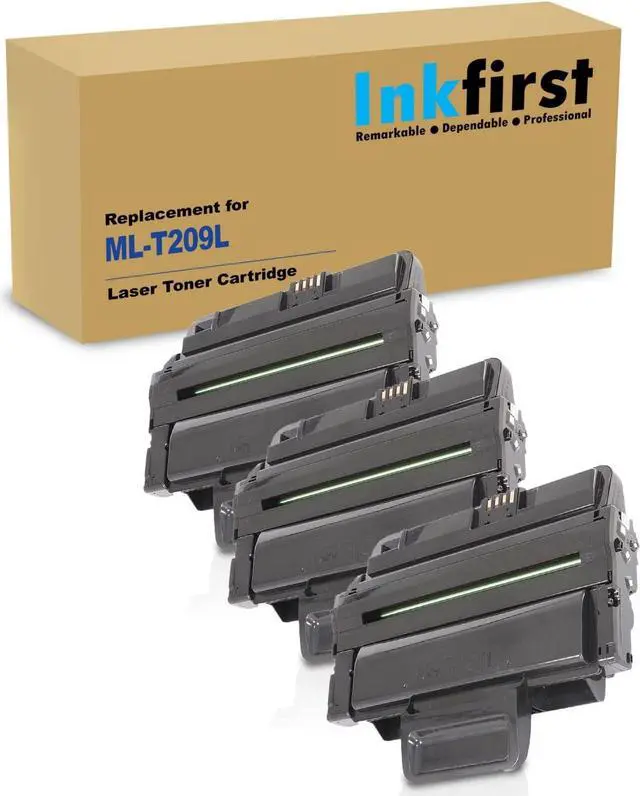 These Inkfirst compatible remanufactured MLT-D209L black toner cartridges are manufactured in ISO9001 and ISO40001 certified manufacturing facilities. These Samsung MLT-D209L replacement toner cartridges are cost-effective and they offer professional high printing quality for all your printing needs. You'll be getting the same OEM Samsung MLT-D209L (MLT-D209L) toner cartridges printing quality but only at a fraction of the cost. Save even more now with the purchasing of this value pack of 3 Samsung MLT-D209L compatible toner cartridges. These replacement Samsung MLT-D209L toner cartridges are for use in the following Samsung printers: Samsung ML-2855ND / SCX-4824FN / SCX-4826FN / SCX-4828FN.