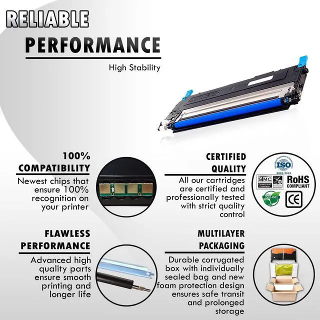 These Inkfirst compatible remanufactured CLT-C409S cyan Toner cartridges are manufactured in ISO9001 and ISO40001 certified manufacturing facilities. These Samsung CLT-C409S replacement Toner cartridges are cost-effective and they offer professional high printing quality for all your printing needs. You'll be getting the same OEM Samsung CLP-315 Cyan Toner cartridges printing quality but only at a fraction of the cost. These replacement Samsung CLP-315 Cyan Toner cartridges are for use in the following Samsung printers: Samsung CLP-310 / CLP-315 / CLP-315W / CLX-3170 / CLX-3175FN / CLX-3175FW.