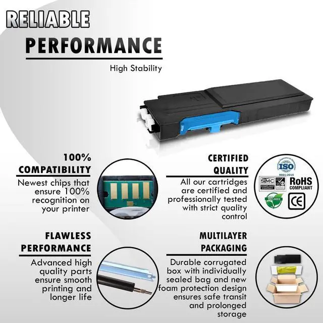 These Inkfirst compatible remanufactured C3760/C3765 331-8432 FMRYP 1M4KP cyan Toner cartridges are manufactured in ISO9001 and ISO40001 certified manufacturing facilities. These Dell 331-8432 FMRYP 1M4KP replacement Toner cartridges are cost-effective and they offer professional high printing quality for all your printing needs. You'll be getting the same OEM Dell C3760/C3765 Cyan Toner cartridges printing quality but only at a fraction of the cost. These replacement Dell C3760/C3765 Cyan Toner cartridges are for use in the following Dell printers: Dell C3760/C3765 / 3000CN.