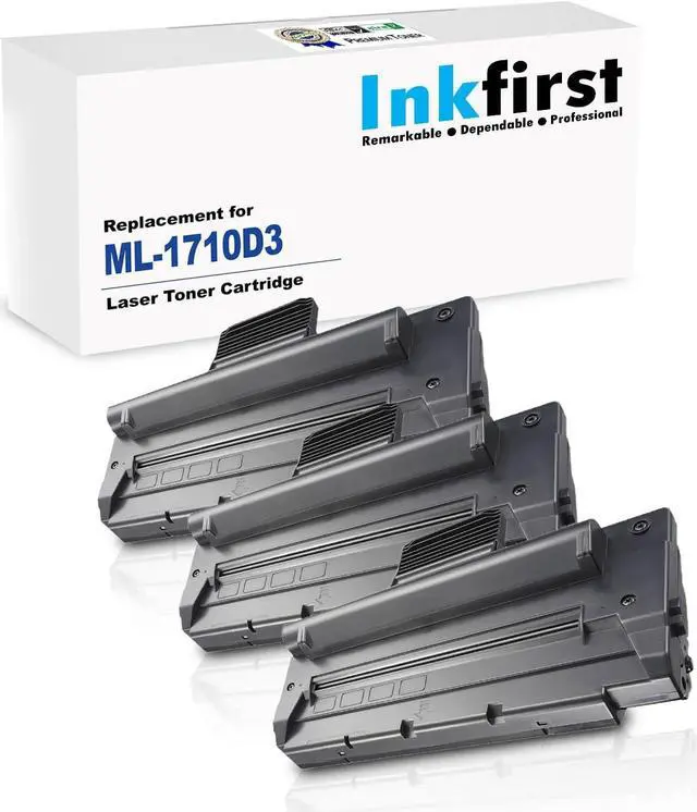 These Inkfirst compatible remanufactured ML-1710 black toner cartridges are manufactured in ISO9001 and ISO40001 certified manufacturing facilities. These Samsung ML-1710 replacement toner cartridges are cost-effective and they offer professional high printing quality for all your printing needs. You'll be getting the same OEM Samsung ML-1710 (ML-1710D3) toner cartridges printing quality but only at a fraction of the cost. Save even more now with the purchasing of this value pack of 3 Samsung ML-1710 compatible toner cartridges. These replacement Samsung ML-1710 toner cartridges are for use in the following Samsung printers: Samsung ML-1500 / ML-1510 / ML-1510B / ML-1710 / ML-1710B / ML-1710D / ML-1710P / ML-1740 / ML-1750 / ML-1755.