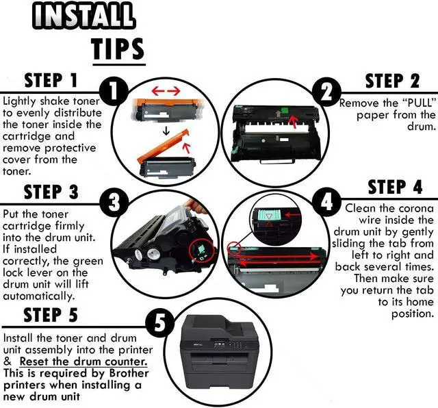 These Inkfirst compatible remanufactured TN-630 DR-630 black toner cartridges & drums are manufactured in ISO9001 and ISO40001 certified manufacturing facilities. These Brother TN-630 DR-630 replacement toner cartridges are cost-effective and they offer professional high printing quality for all your printing needs. You'll be getting the same OEM Brother TN-630 (TN630) toner cartridges & DR-630 (DR630) drum unit printing quality but only at a fraction of the cost. Save even more now with the purchasing of this value pack of 2 Brother TN-630 DR-630 compatible toner cartridges & drums. These replacement Brother TN-630 DR-630 toner cartridges & drums are for use in the following Brother printers: Brother DCP-L2520DW/ DCP-L2540DW/ HL-L2300D/ HL-L2305W/ HL-L2320D/ HL-L2340DW/ HL-L2360DW/ HL-L2380DW/ MFC-L2700DW/ MFC-L2720DW/ MFC-L2740DW.