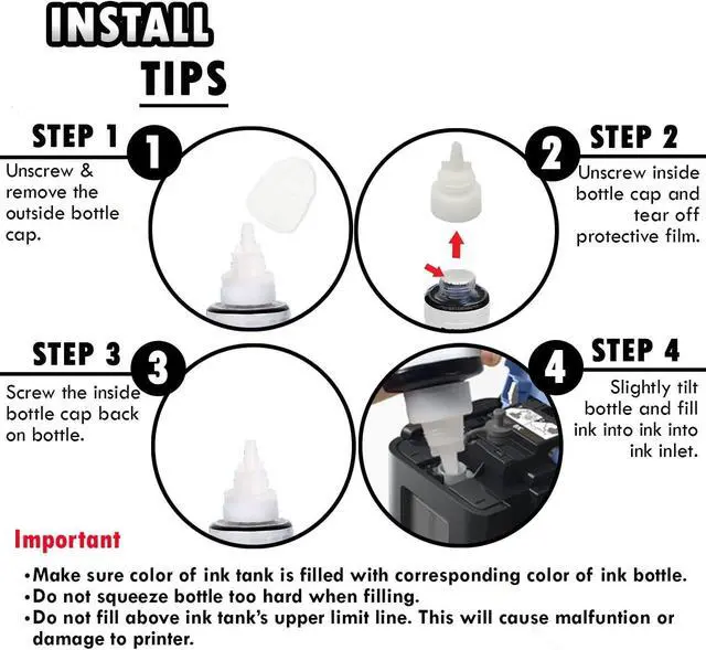 PRODUCT INFO Inkfirst Compatible Mega Tank Ink Bottles Replacement for Canon 290 GI-290 4PK Package Contents INK CARTRIDGE DETAILS 100% Compatibility Professional Quality High Stability Precisely Engineered INSTALL TIPS STEP 1 STEP 2 STEP 3 STEP 4