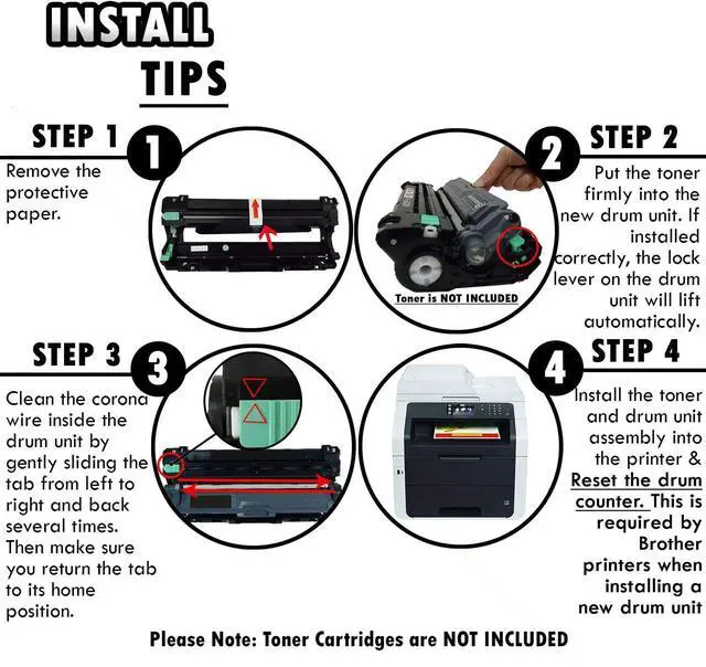 PRODUCT INFO Compatible Drum Units for Brother DR-221CL BK C M Y WORK WITH: Package Contents INK CARTRIDGE DETAILS Top Quality Photoconductor Drum Professional Printing Advanced High-quality parts Precisely Engineered INSTALL STEP 4