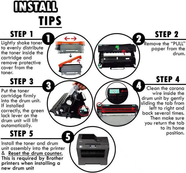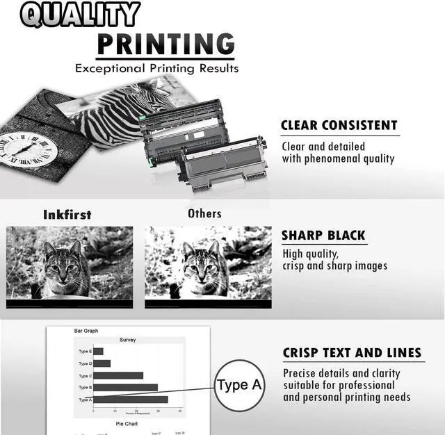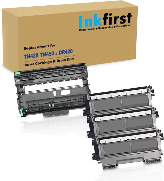 These Inkfirst compatible remanufactured TN-420 TN-450 DR-420 black toner cartridges & drums are manufactured in ISO9001 and ISO40001 certified manufacturing facilities. These Brother TN-420 TN-450 DR-420 replacement toner cartridges are cost-effective and they offer professional high printing quality for all your printing needs. You'll be getting the same OEM Brother TN-420 TN-450 (TN420 TN450) toner cartridges & DR-420 (DR420) drum unit printing quality but only at a fraction of the cost. Save even more now with the purchasing of this value pack of 4 Brother TN-420 TN-450 DR-420 compatible toner cartridges & drums. These replacement Brother TN-420 TN-450 DR-420 toner cartridges & drums are for use in the following Brother printers: Brother DCP-7060D / DCP-7065DN, HL-2220 / HL-2230 / HL-2240 / HL-2240D / HL2270DW / HL-2280DW, MFC-7360N / MFC-7460DN / MFC-7860DW.