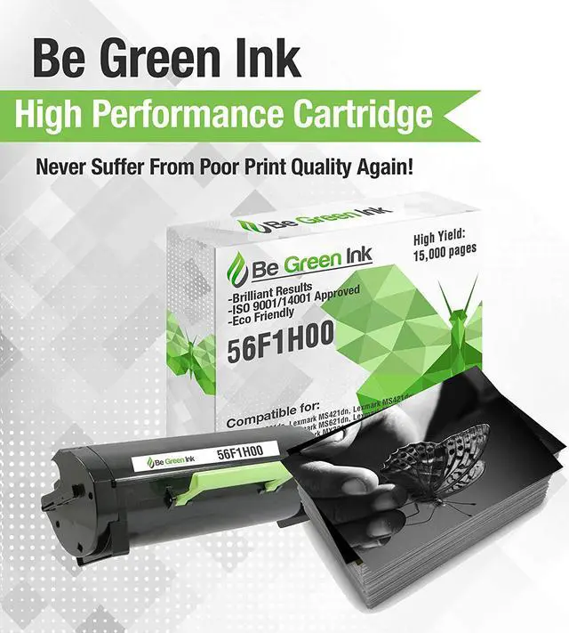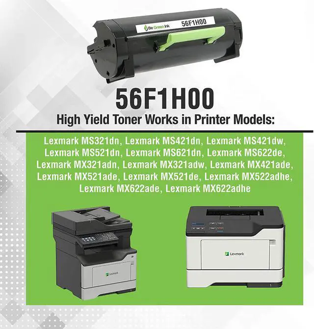 • 1. Outstanding money-back guarantee & lifetime warranty on Lexmark 56F1H00 Toner Our Be Green Ink Brand toner cartridges are meticulously built with industry leading technology that ensures a reliable cartridge with clear and crisp prints every time. This is why we are able to offer this incredible industry leading warranty.