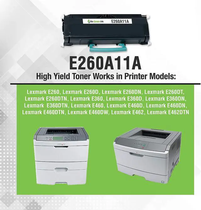 Be Green Ink Compatible Replacement Black Toner Cartridge for Lexmark E260, E260D, E260DN, E260DT, E260DTN, E360, E360D, E360DN, E360DTN, E460, E460D, E460DN, E460DTN, E460DW, E462, E462DTN - E260A11A for use in the following Lexmark Printers: Lexmark E260 Lexmark E260D Lexmark E260DN Lexmark E260DT Lexmark E260DTN Lexmark E360 Lexmark E360D Lexmark E360DN Lexmark E360DTN Lexmark E460 Lexmark E460D Lexmark E460DN Lexmark E460DTN Lexmark E460DW Lexmark E462 Lexmark E462DTN 1. Outstanding money-back guarantee & lifetime warranty on Lexmark E260A11A Toner Our Be Green Ink Brand toner cartridges are meticulously built with industry leading technology that ensures a reliable cartridge with clear and crisp prints every time. This is why we are able to offer this incredible industry leading warranty. 2. Works In- Lexmark E260, Lexmark E260D, Lexmark E260DN, Lexmark E260DT, Lexmark E260DTN, Lexmark E360, Lexmark E360D, Lexmark E360DN, Lexmark E360DTN, Lexmark E460, Lexmark E460D, Lexmark E460DN, Lexmark E460DTN, Lexmark E460DW, Lexmark E462, Lexmark E462DTN 3. High Yield Black Toner 3,500 pages 4. Whats in The Box (1) Lexmark E260A11A Black Compatible Replacement Toner Cartridges with New Next Generation Technology for Unprecedented Quality that is meticulously built to ensure a reliable cartridge with crisp clear prints every time. 5. Our Friendly Staff is Always Ready to Help You With Anything If there is any issues whatsoever with your order, please contact Be Green Ink directly, we promise to solve your problem for you right away. Be Green Ink Compatible Replacement Black Toner Cartridge for Lexmark E260, E260D, E260DN, E260DT, E260DTN, E360, E360D, E360DN, E360DTN, E460, E460D, E460DN, E460DTN, E460DW, E462, E462DTN - E260A11A are made in an ISO 9001/14001 certified manufacturing facility and are tested to ensure print quality.