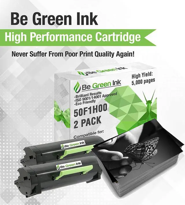 Be Green Ink Compatible Replacement Black Toner Cartridge for Lexmark MS310dn MS312dn MS315dn MS410dn MS415dn MS510dn MS610dn 50F1H00 Black Toner (2 Pack 5,000 High Yield) for use in the following Lexmark Printers: Lexmark MS310, Lexmark MS310d, Lexmark MS310dn, Lexmark MS312, Lexmark MS312dn, Lexmark MS315, Lexmark MS315dn, Lexmark MS410, Lexmark MS410d, Lexmark MS410dn, Lexmark MS415, Lexmark MS415dn, Lexmark MS510, Lexmark MS510dn, Lexmark MS610, Lexmark MS610de, Lexmark MS610dn, Lexmark MS610dte, Lexmark MS610dtn 1. Outstanding money-back guarantee & lifetime warranty on Lexmark 50F1H00 Toner Our Be Green Ink Brand toner cartridges are meticulously built with industry leading technology that ensures a reliable cartridge with clear and crisp prints every time. This is why we are able to offer this incredible industry leading warrantee. 2. Works In- Lexmark MS310, MS310d, MS310dn, MS312, MS312dn, MS315, MS315dn, MS410, MS410d, MS410dn, MS415, MS415dn, MS510 MS510dn, MS610, MS610de, MS610dn, MS610dte, MS610dtn 3. High Yield Black Toner 5,000 pages 4. Whats in The Box (2) Lexmark 50F1H00 Black Compatible Replacement Toner Cartridges with New Next Generation Technology for Unprecedented Quality that is meticulously built to ensure a reliable cartridge with crisp clear prints every time. 5. Our Friendly Staff is Always Ready to Help You With Anything If there is any issues whatsoever with your order, please contact Be Green Ink directly, we promise to solve your problem for you right away. Be Green Ink Compatible Replacement Black Toner Cartridge for Lexmark MS310dn MS312dn MS315dn MS410dn MS415dn MS510dn MS610dn 50F1H00 Black Toner (2 Pack 5,000 High Yield) are made in an ISO 9001/14001 certified manufacturing facility and are tested to ensure print quality.