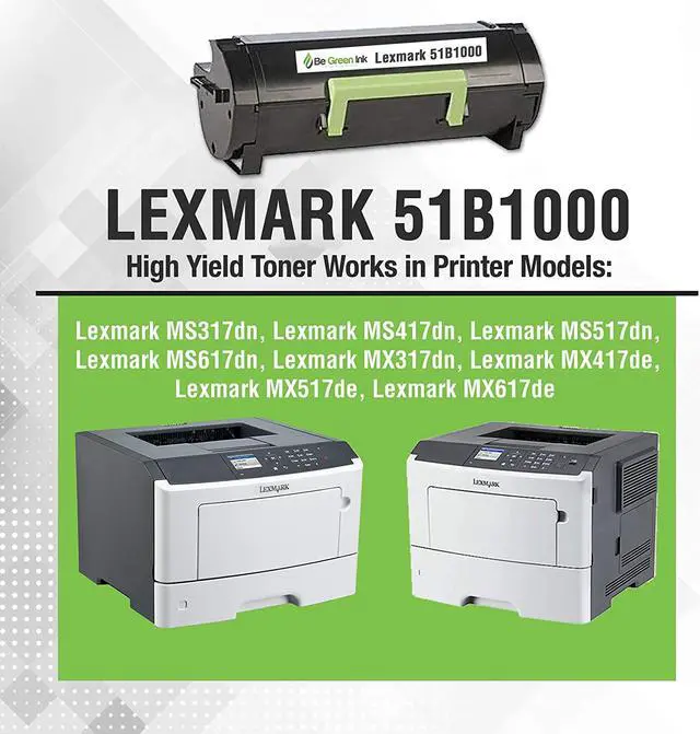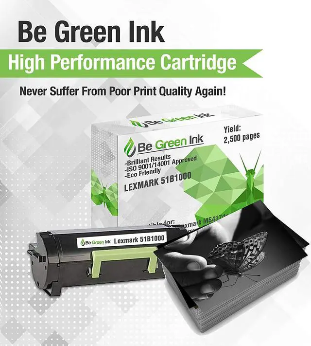 Be Green Ink Compatible Replacement Black Toner Cartridge for Lexmark MS317dn MS417dn MS517dn MS617dn MX317dn MX417de MX517de MX617de - 51B1000 Black Toner for use in the following Lexmark Printers: Lexmark MS317dn Lexmark MS417dn Lexmark MS517dn Lexmark MS617dn Lexmark MX317dn Lexmark MX417de Lexmark MX517de Lexmark MX617de 1. Outstanding money-back guarantee & lifetime warranty on Lexmark 51B1000 Toner Our Be Green Ink Brand toner cartridges are meticulously built with industry leading technology that ensures a reliable cartridge with clear and crisp prints every time. This is why we are able to offer this incredible industry leading warrantee. 2. Works In- Lexmark MS317dn, Lexmark MS417dn, Lexmark MS517dn, Lexmark MS617dn, Lexmark MX317dn, Lexmark MX417de, Lexmark MX517de, Lexmark MX617de 3. High Yield Black Toner 2,500 pages 4. Whats in The Box (1) Lexmark 51B1000 Black Compatible Replacement Toner Cartridges with New Next Generation Technology for Unprecedented Quality that is meticulously built to ensure a reliable cartridge with crisp clear prints every time. 5. Our Friendly Staff is Always Ready to Help You With Anything If there is any issues whatsoever with your order, please contact Be Green Ink directly, we promise to solve your problem for you right away. Be Green Ink Compatible Replacement Black Toner Cartridge for Lexmark MS317dn MS417dn MS517dn MS617dn MX317dn MX417de MX517de MX617de - 51B1000 Black Toner is made in an ISO 9001/14001 certified manufacturing facility and are tested to ensure print quality.