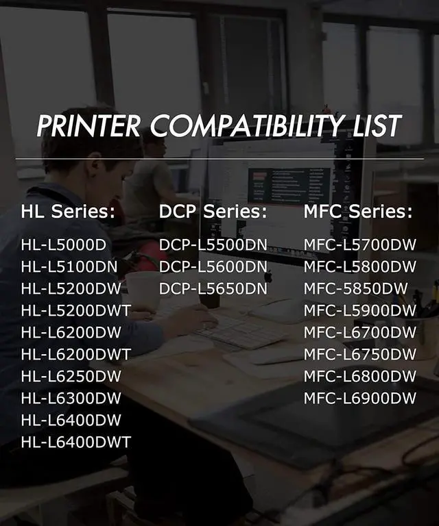 Compatible With Brother Laser Printer - Monochrome:Brother Labser Printers HLL5000D, HLL5100DN, HLL5200DW, HLL5200DWT, HLL6200DW, HLL6200DWT, HLL6300DW, HLL5700DW, MFCL5800DW, MFC5850DW, MFCL5900DW, MFCL6700DW, MFCL6800DW, DCPL5500DN, DCPL5600DN, DCPL5650DN
