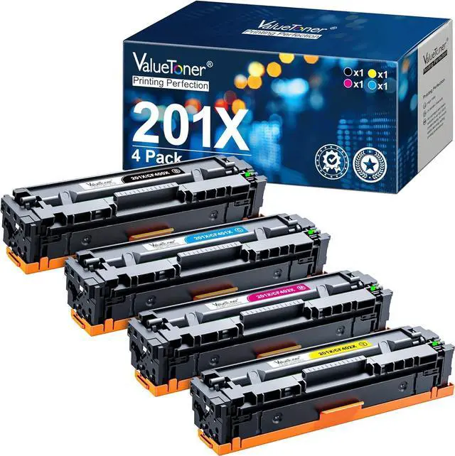 Contents: 4 Pack of Valuetoner 201X Toner cartridges Replacement for HP 201X, for HP 201A Black/Cyan/Yellow/Magenta