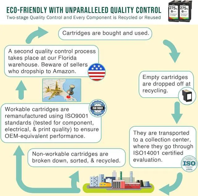 GET RELIABLE, QUALITY PRINTS AS GOOD AS ORIGINAL INK. Get your ink from a US-based, accountable company that can be reached easily. Our remanufactured ink cartridges are tested to ensure consistent, quality prints that match the image/text seen on one's printer both at the component level and with print tests. All cartridges are tested both at manufacturing, and again at our FL warehouse. This is done to ensure our ink perfectly matches your printing needs- with vivid colors and sharp text.