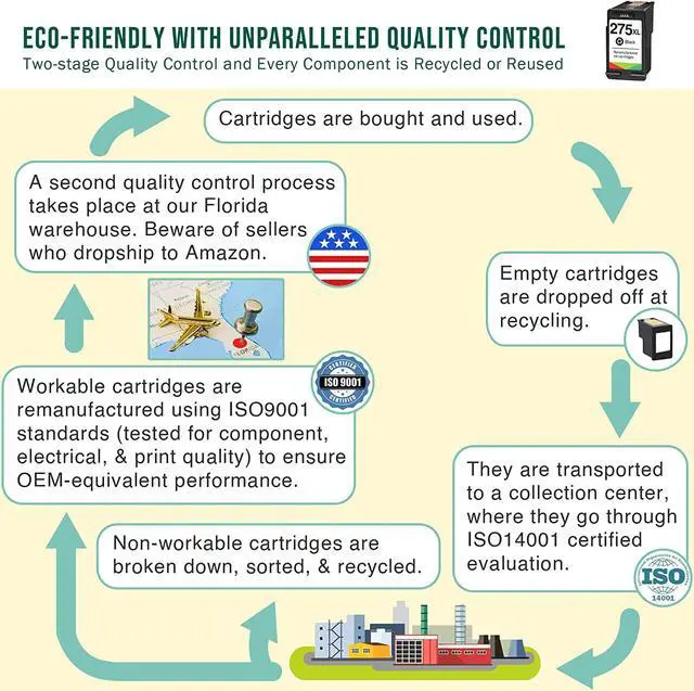 GET RELIABLE, QUALITY PRINTS AS GOOD AS ORIGINAL INK. Get your ink from a US-based, accountable company that can be reached easily. Our remanufactured ink cartridges are tested to ensure consistent, quality prints that match the image/text seen on one's printer both at the component level and with print tests. All cartridges are tested both at manufacturing, and again at our FL warehouse. This is done to ensure our ink perfectly matches your printing needs- with vivid colors and sharp text.