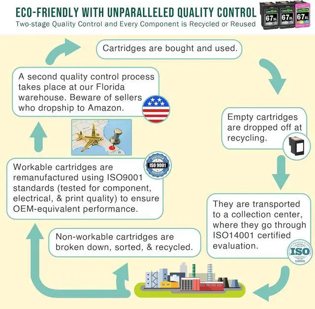 -GET RELIABLE, QUALITY PRINTS AS GOOD AS ORIGINAL INK. Get your ink from a US-based, accountable company that can be reached easily. Our remanufactured ink cartridges are tested to ensure consistent, quality prints that match the image/text seen on one's printer both at the component level and with print tests. All cartridges are tested both at manufacturing, and again at our FL warehouse. This is done to ensure our ink perfectly matches your printing needs- with vivid colors and sharp text.