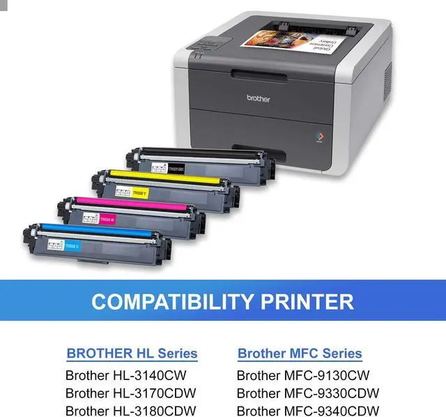 Arthur Imaging Compatible Toner Cartridge Replacement for Brother TN221, TN225, TN225, TN225 (2 Black, Cyan, Yellow, Magenta, 5-Pack) is to perform with your Brother laser printer. It replaces the original Brother TN221/TN225 laser toner cartridge, and can be used in the following Brother Printers: HL Printers: HL-3140W, HL-3170CDW MFC Multifunction Printers: MFC-9130CW, MFC-9330CDW, MFC-9340CDW This is not a remanufactured cartridge and it was not manufactured by Brother. Our compatible replacement 221/225 laser toner cartridge is specially engineered to meet the highest standards of quality and reliability. Our 221/225 toner page yield meets or exceeds OEM (Original Equipment Manufacturer) page yield for the Brother TN221/TN225 and offers high-quality printing results. The use of Arthur Imaging compatible replacement laser toner cartridges and supplies does not void your printer's warranty. We offer a 100% Quality Satisfaction on our Arthur Imaging compatible 221/225 laser toner cartridges and supplies.