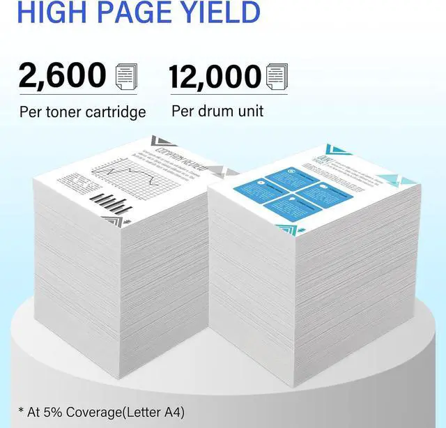 One black toner can print up to 2600 pages and one drum can print up to 12000 pages at 5% coverage Letter/A4.