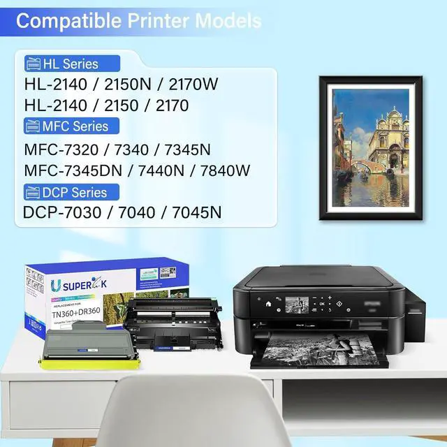 SuperInk Products Toner Cartridge is optimally designed to replace your Brother TN360 Toner and DR360 Drum cartridges and provide excellent printing performance.