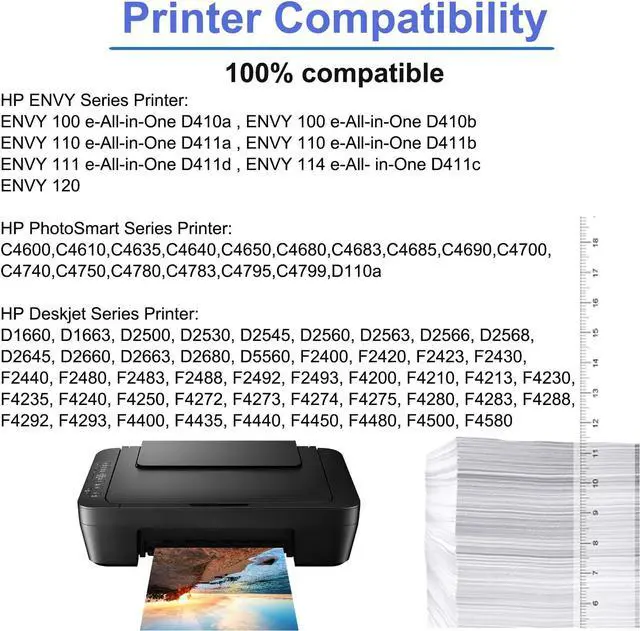 Compatible for HP PrintersDeskJet D1660 D1663 D2530 D2545 D2560 D2563 D2566 D2568 D2645 D2660 D2663 D2680 F2400 F2420 F2423 F2430 F2480 F2483 F2488 F2492 F2493 F4210 F4213 F4230 F4235 F4240 F4250 F4272 F4273 F4274 F4275 F4280 F4283 F4288 F4292 F4293 F4400 F4435 F4440 F4450 F4480 F4500 F4580; ENVY 100 e-All-in-One D410a, 110 e-All-in-One D411a, 111 e-All-in-One D411d, 114 e-All- in-One D411c; Photosmart C4600 C4700 D110a; Envy 120 Printer.