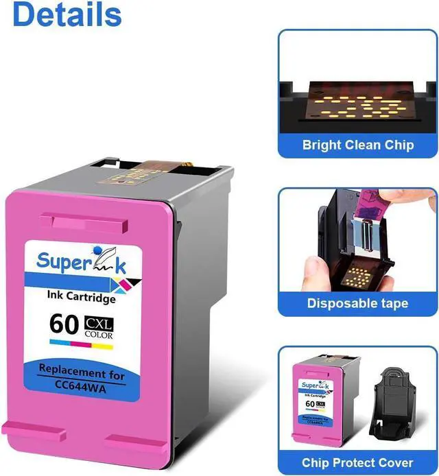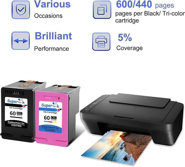 Package ContentsSuperInk Alternative Replacement for OEM HP 60 60XL 60 XL CC641WN Black CC644WN Tri-color High Yield Ink Cartridge 1 Black, 1 Tri-Color).