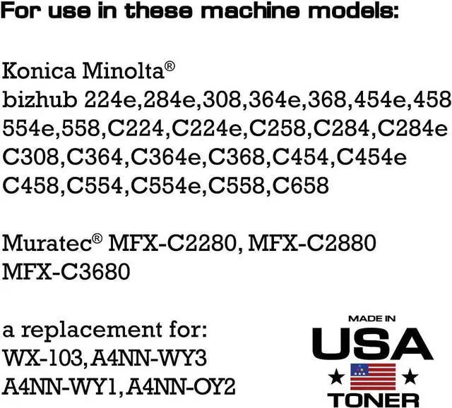1 Premium WASTE toner container for use in Konica Minolta bizhub 224e,284e,308,364e,368,454e,458, 554e,558,C224,C224e,C258,C284,C284e, C308,C364,C364e,C368,C454,C454e,C458,C554,C554e,C558,C658 and Muratec MFX-C2280, MFX-C2880 MFX-C3680. A compatible replacement for WX-103, A4NN-WY3
