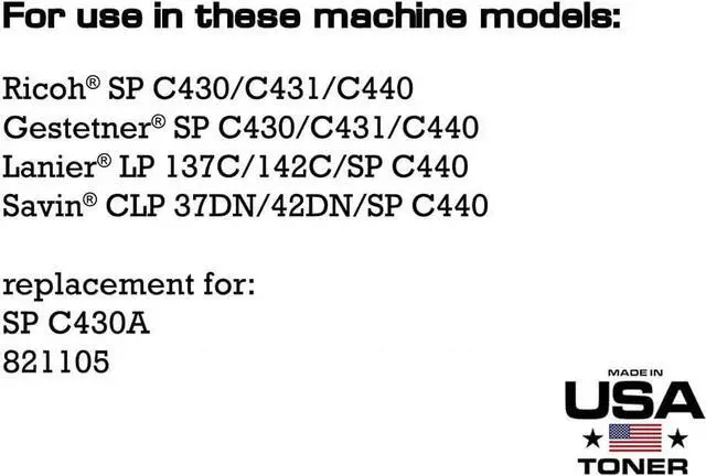 Black Toner Kit for Ricoh SP C430, SP C431, SP C440, Gestetner SP C430, SP C431, SP C440, Lanier LP 137C, LP 142C, LP SP C440, Savin CLP 37DN, CLP 42DN, SP C440; Kit contains 2 toner cartridges; Offering the same print quality and yield as the OEM, but a much better value.
