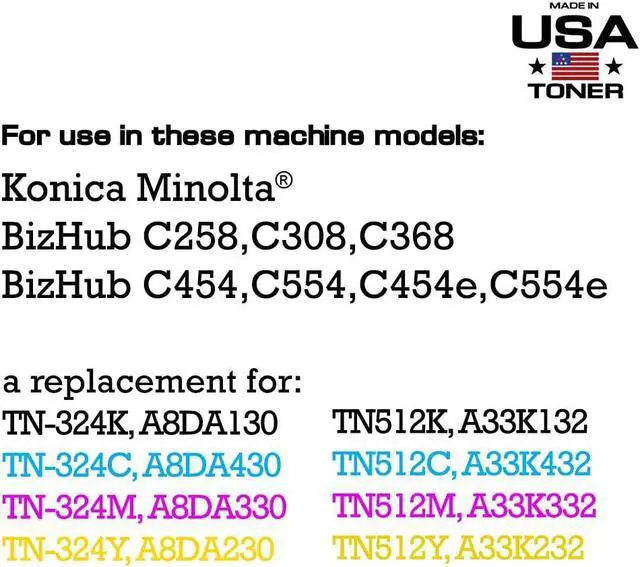 Compatible Replacement Toner Cartridges for Konica Minolta TN-324K (A8DA130),TN-324C (A8DA430),TN-324M (A8DA330),TN-324Y (A8DA230),TN-512K (A33K132),TN-512C (A33K432),TN-512M (A33K332), TN-512Y (A33K232)