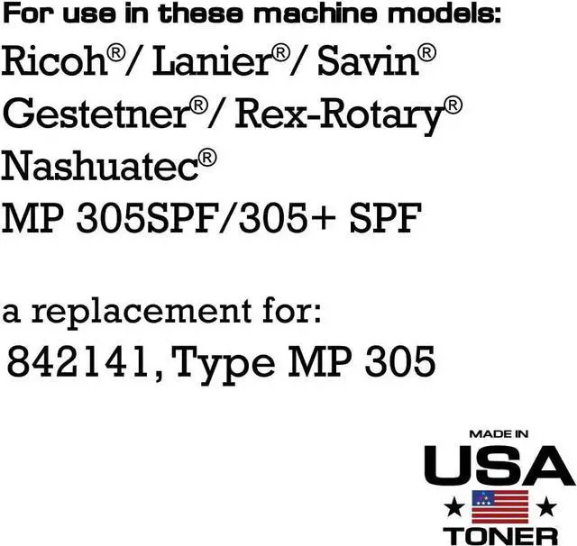 Black Toner cartridge for Ricoh 842141, MP 305spf, MP305+, Type 305 Toner Cartridge for Use in Ricoh Savin Lanier MP305SPF MP 305SPF Replaces Ricoh Type MP305, 842141 Page Yield: 9000 pages per cartridge Made in USA; not imported Premium Compatible