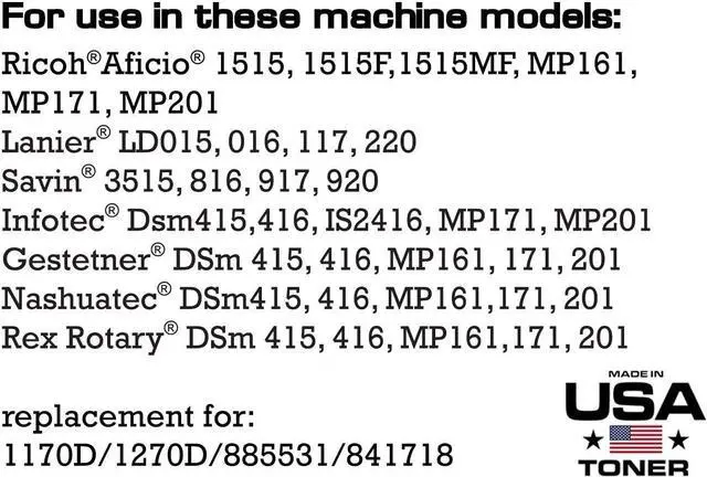 For use in Ricoh Aficio 1515, 1515F,1515MF, MP161, MP171, MP201, Lanier LD015, 016, 117, 220, Savin 3515, 816, 917, 920, Infotec Dsm415,416, IS2416, MP171, MP201, Gestetner DSm 415, 416, MP161, 171, 201, Nashuatec DSm415, 416, MP161,171, 201, Rex Rotary DSm 415, 416, MP161,171, 201