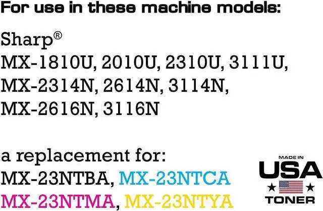Compatible Replacement Toner Cartridges for Sharp MX-23NTBA, MX-23NTCA, MX-23NTMA, MX-23NTYA