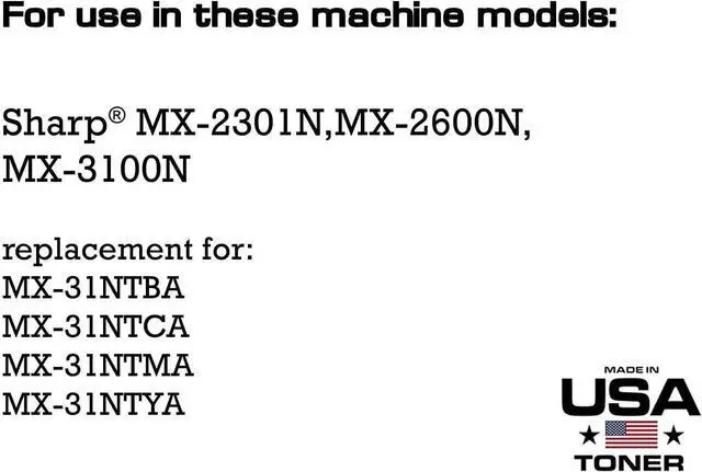 • Replacement for: Sharp MX-31NTBA for black, MX-31NTCA for cyan, MX-31NTMA for magenta, MX-31NTYA for yellow