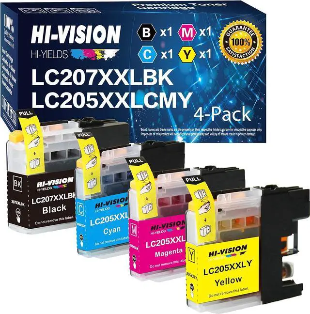 HI-VISION HI-YIELDS Brand compatible LC207XXL Black, LC205XL Cyan, LC205XL Yellow and LC205XL Magenta Super High Yield inkjet cartridge are guaranteed to perform with your Color Inkjet printer. They replace the original LC207BK, LC205C, LC205Y and LC205M. Our compatible replacement LC207XXL Black, LC205XL Cyan, LC205XL Yellow and LC205XL Magenta cartridges are specially tested to meet the highest standards of quality, reliability and exceptional yields that meet or exceed OEM (Original Equipment Manufacturer) standards and also offer high-quality printing results. The use of compatible replacement laser toner cartridges and supplies does not void your printers warranty by law.